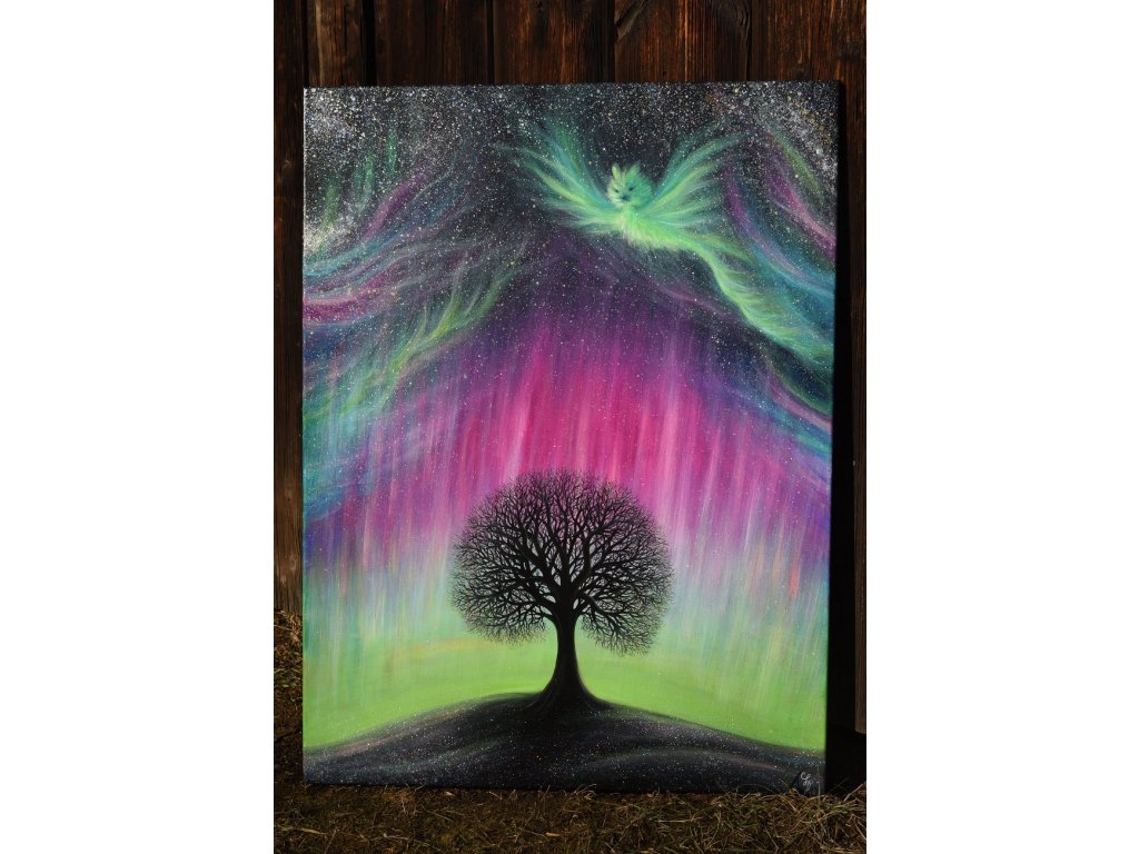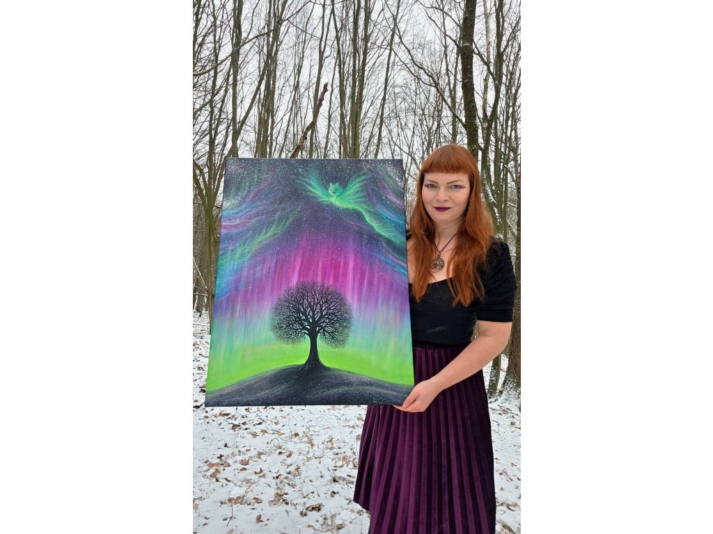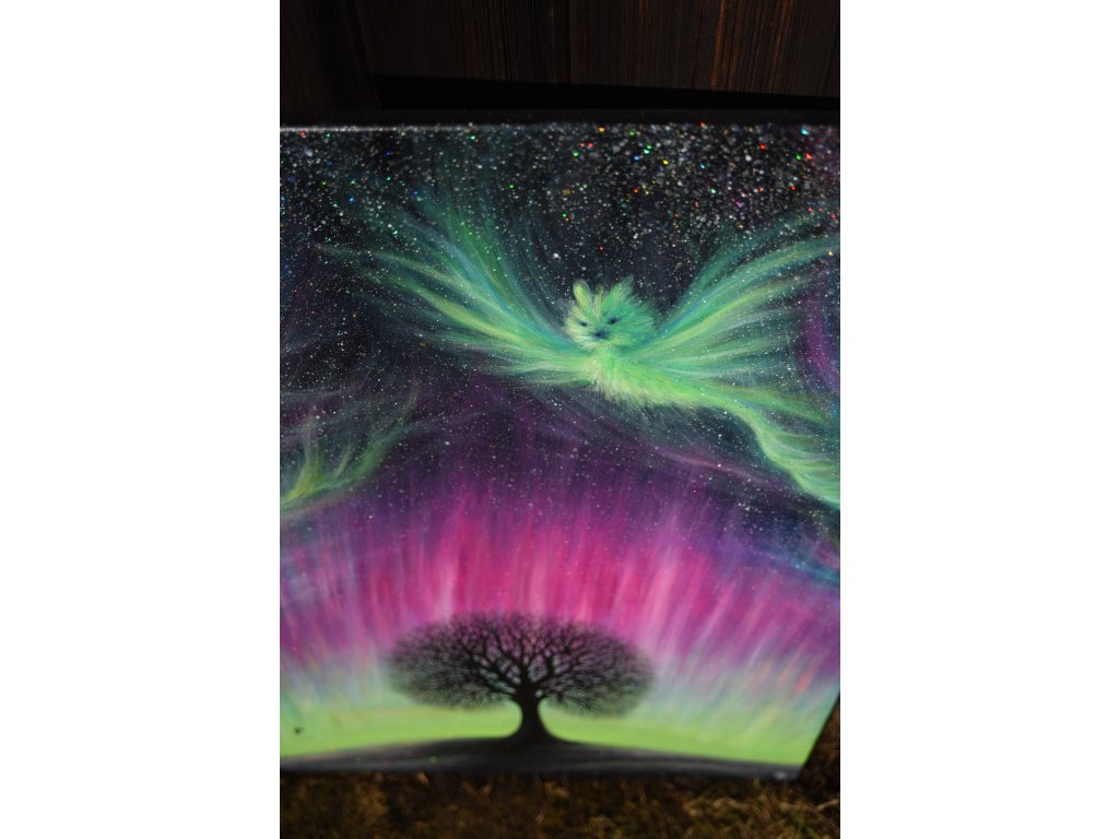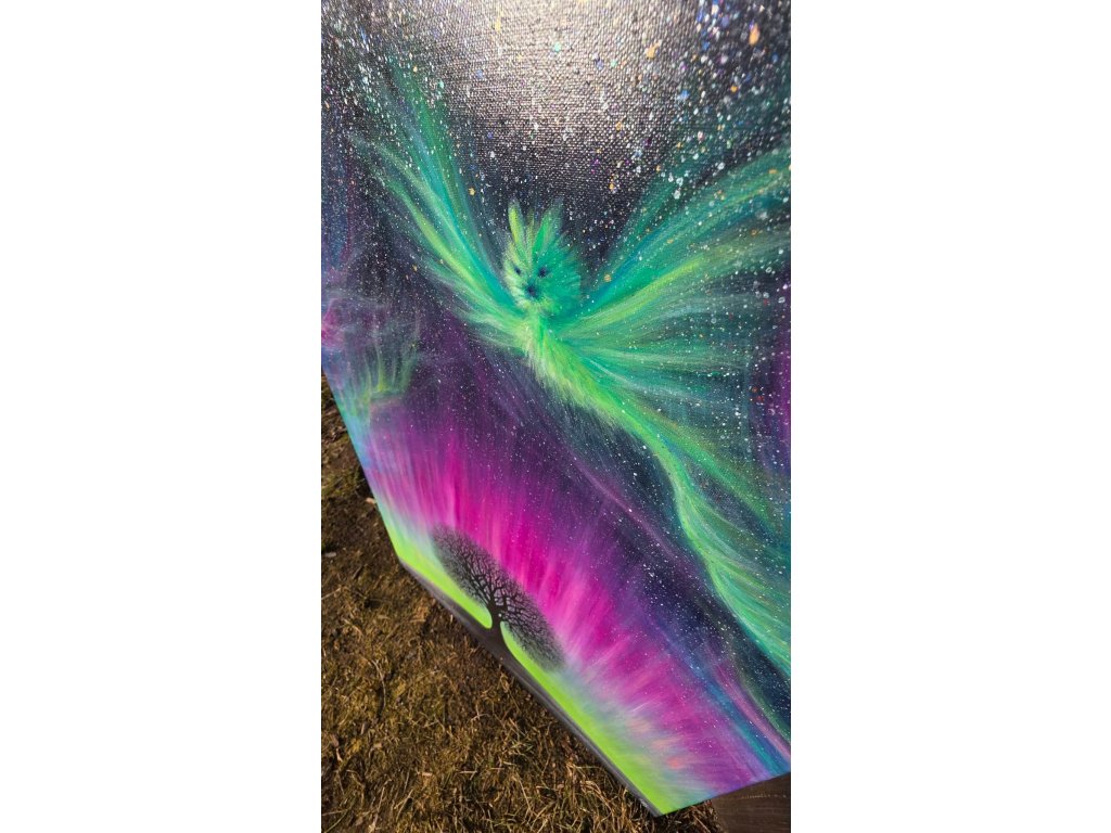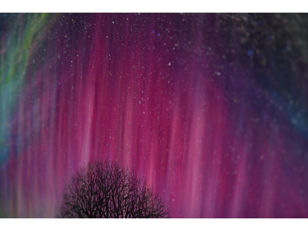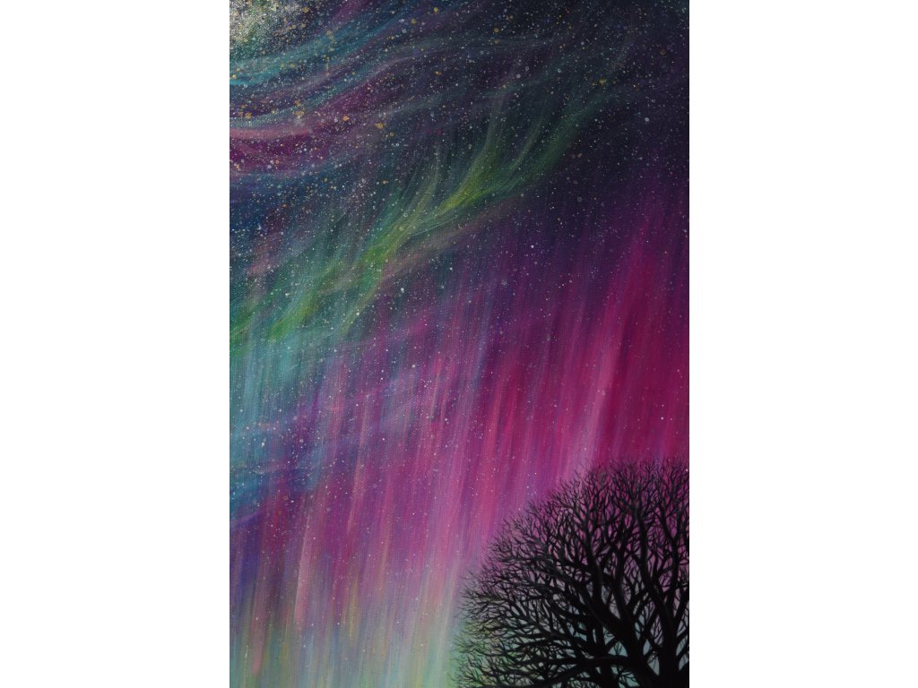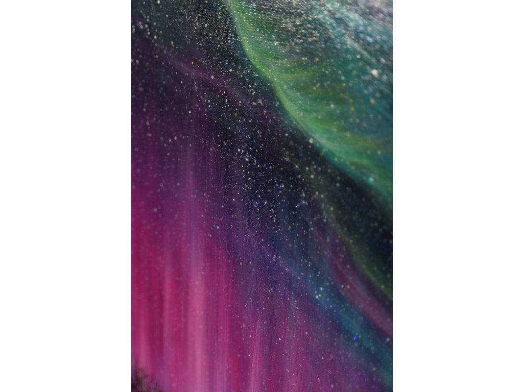 Při spontánní malbě tohoto obrazu jsem se lehce inspirovala fascinující polární září, která byla na našem území viditelná během pozdního večera 19.1. 2026. Vypravila jsem se ji fotit i přes nepříznivé podmínky větru a mrazu, které tou dobou byly u nás na severu Čech. Podařilo se mi ji zachytit na začátku ještě bez stativu nad naším domem a v její druhé polovině i se stativem na louce za vesnicí. Během příprav na výšlap jsem sice přišla o většinu jejího zeleného "lemování", ale alespoň jeho závěr se mi podařilo zachytit. Dál si však hrála ještě hodinu ve fialových, purpurových až červených tónech, která jsou na našem území běžnější. Byla to neskutečná nádhera. V životě jsem takovou parádu neviděla!