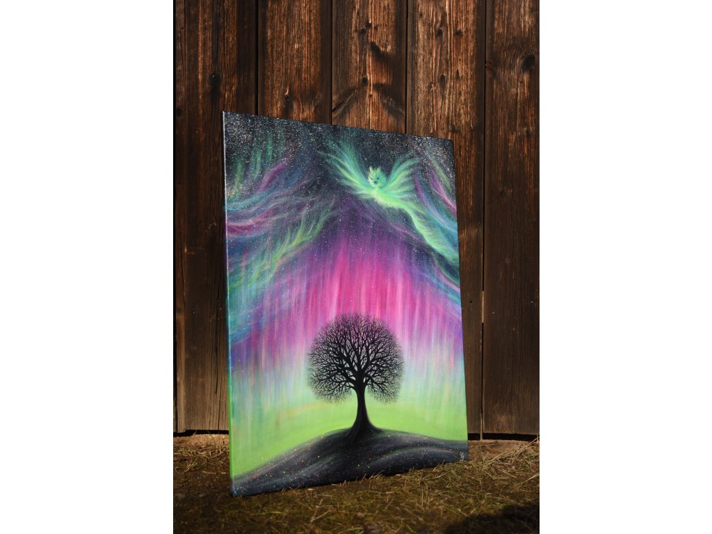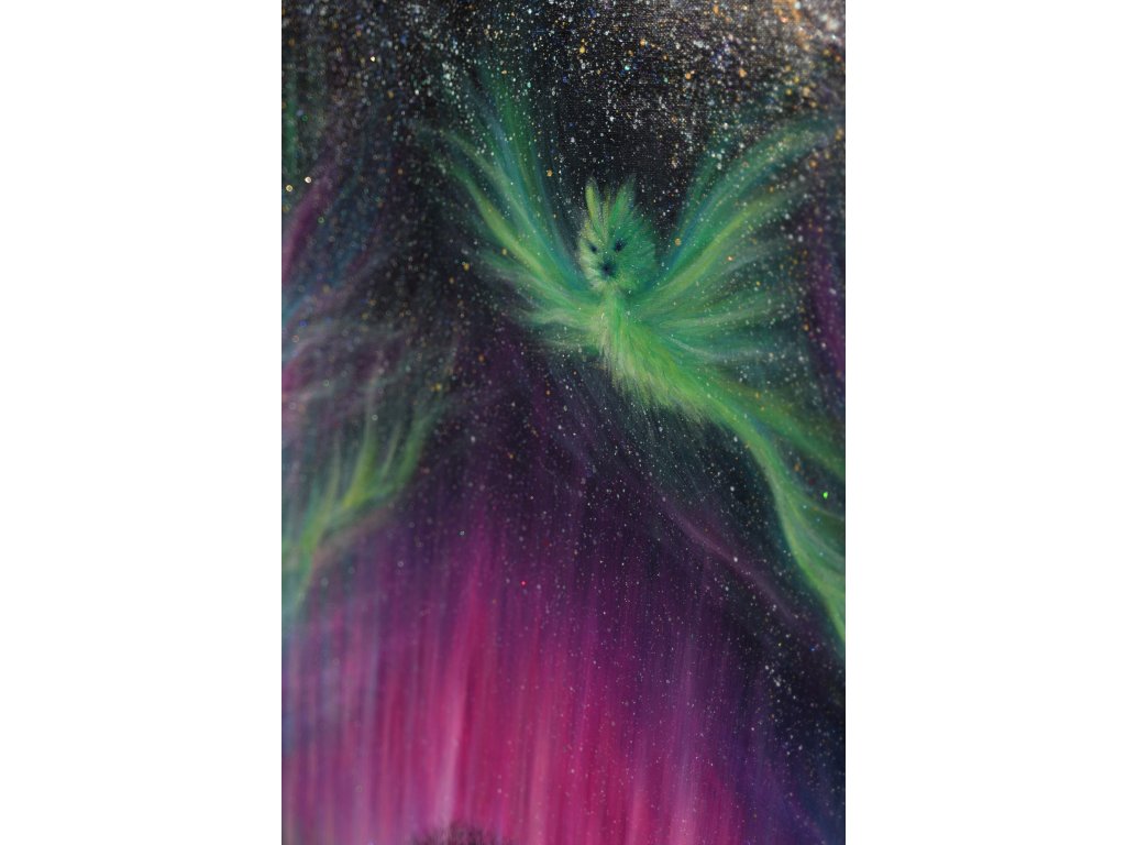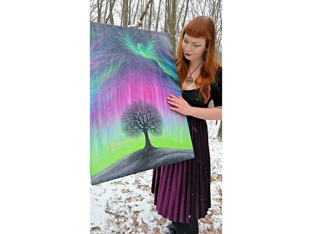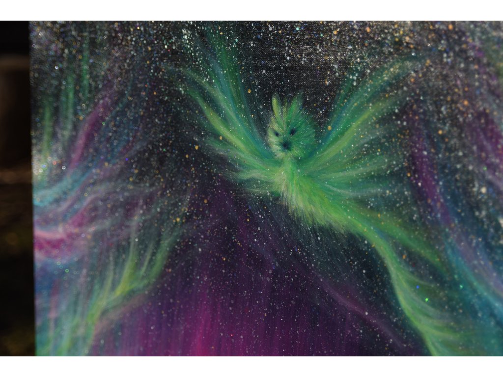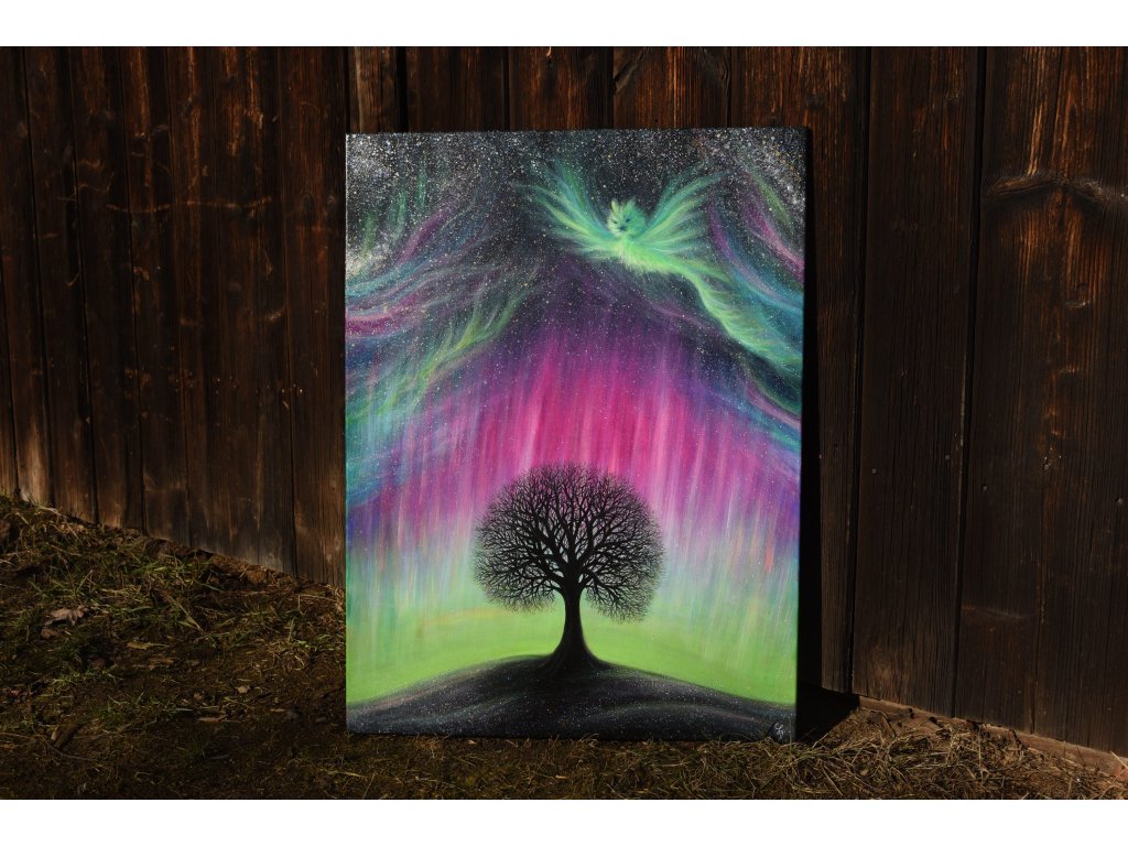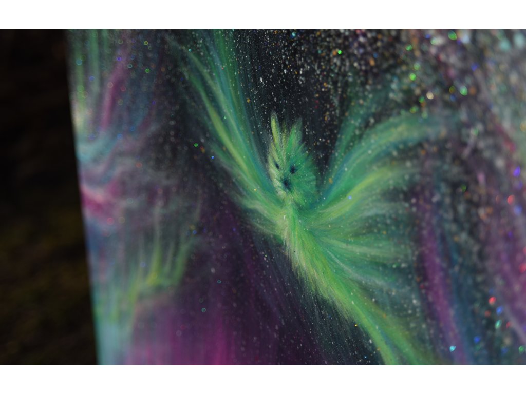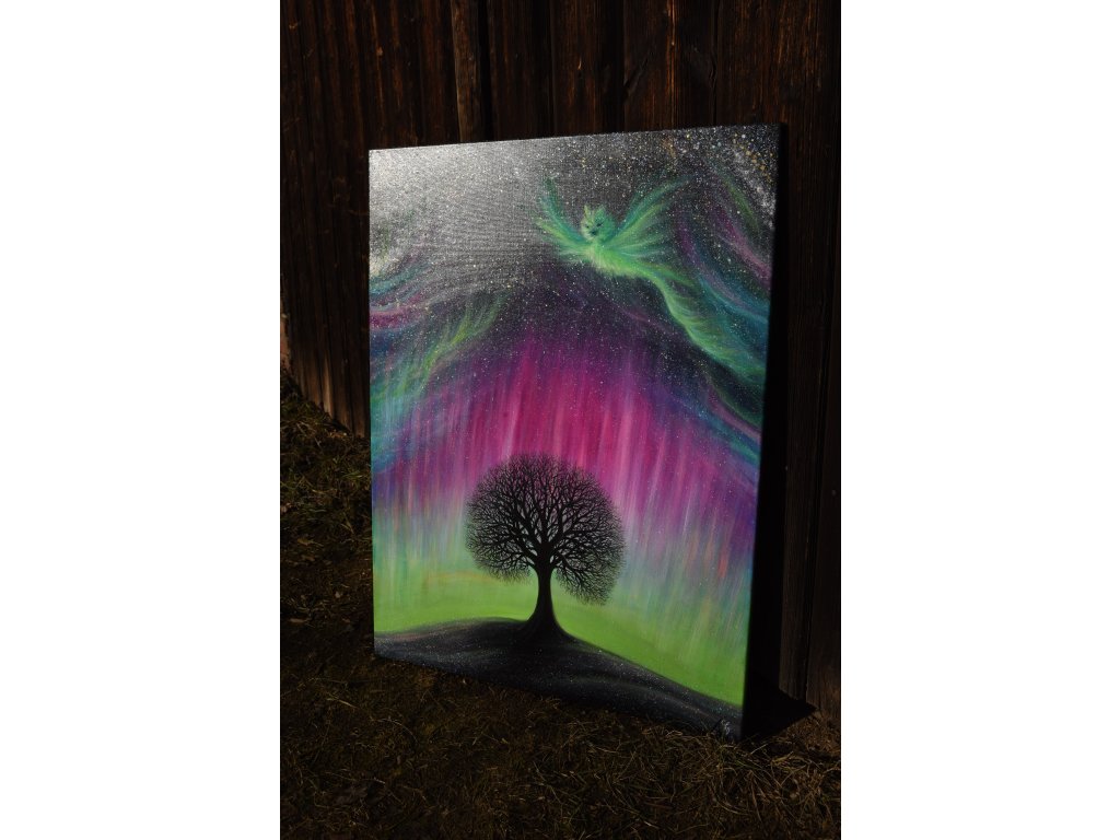Při spontánní malbě tohoto obrazu jsem se lehce inspirovala fascinující polární září, která byla na našem území viditelná během pozdního večera 19.1. 2026. Vypravila jsem se ji fotit i přes nepříznivé podmínky větru a mrazu, které tou dobou byly u nás na severu Čech. Podařilo se mi ji zachytit na začátku ještě bez stativu nad naším domem a v její druhé polovině i se stativem na louce za vesnicí. Během příprav na výšlap jsem sice přišla o většinu jejího zeleného "lemování", ale alespoň jeho závěr se mi podařilo zachytit. Dál si však hrála ještě hodinu ve fialových, purpurových až červených tónech, která jsou na našem území běžnější. Byla to neskutečná nádhera. V životě jsem takovou parádu neviděla!