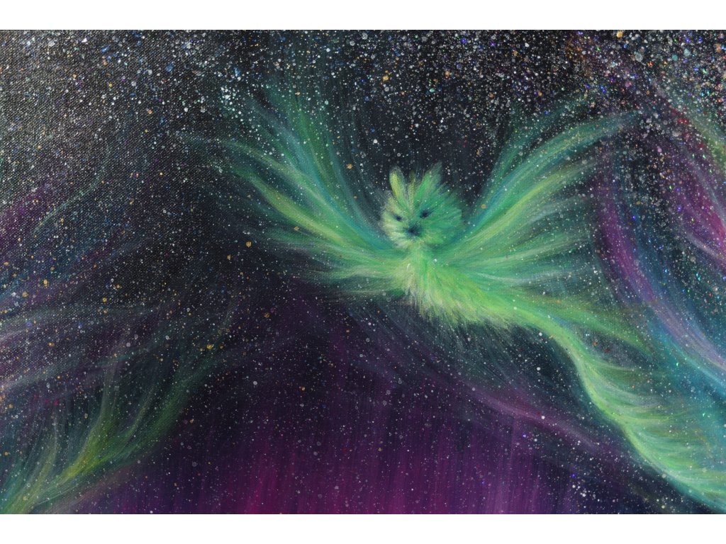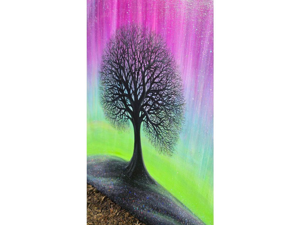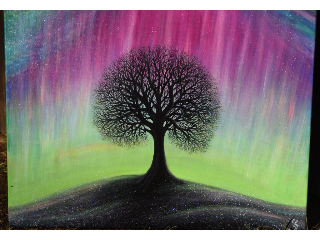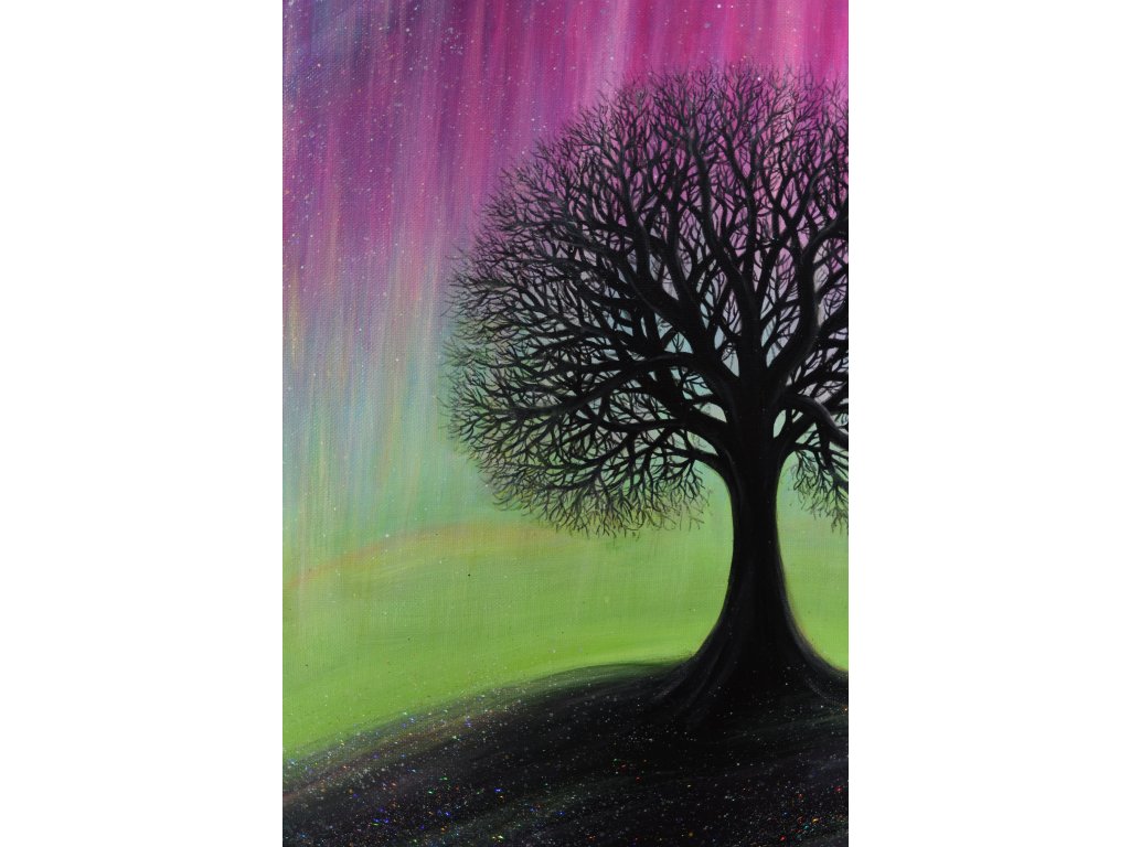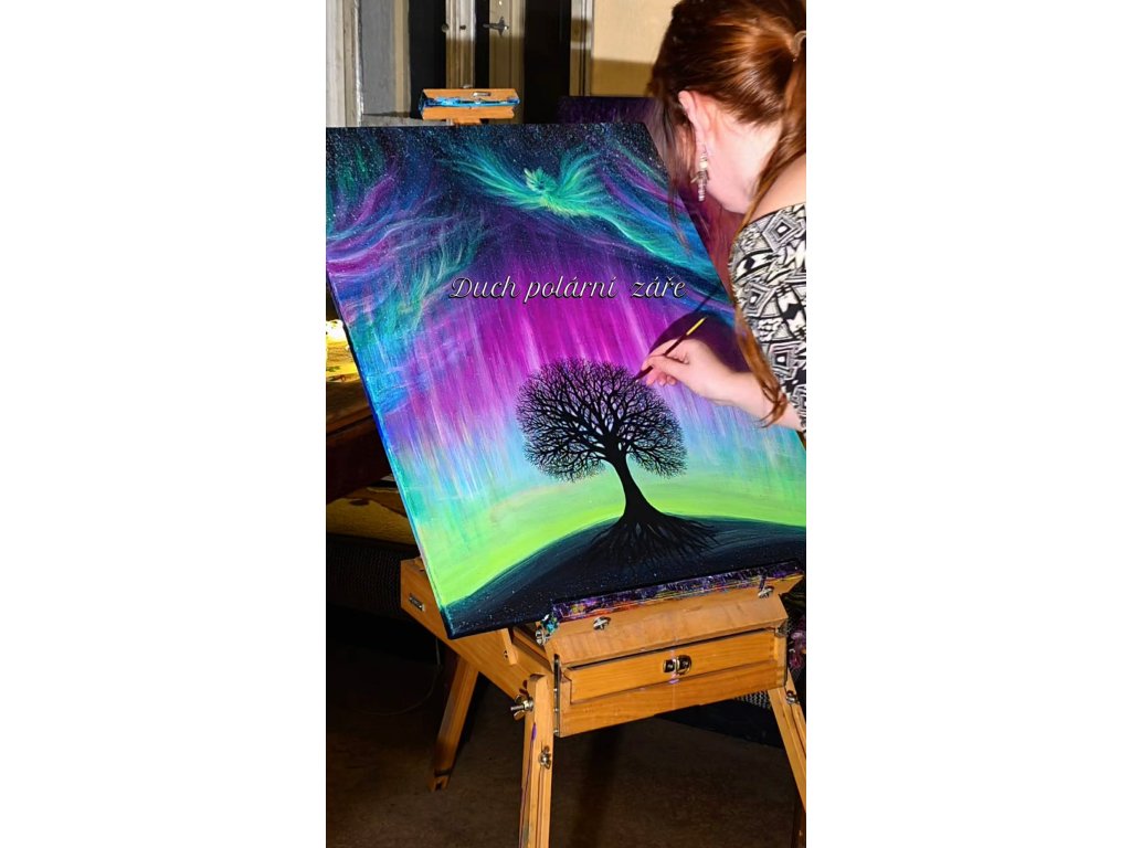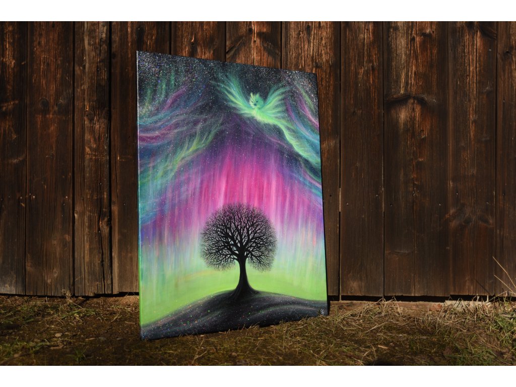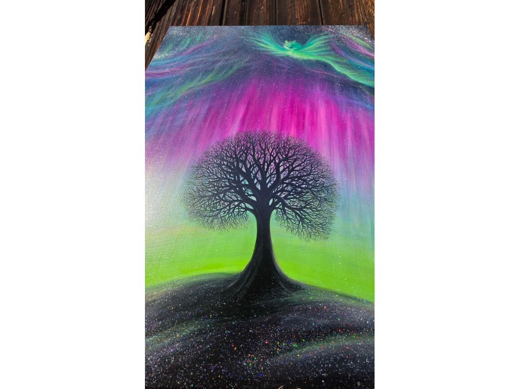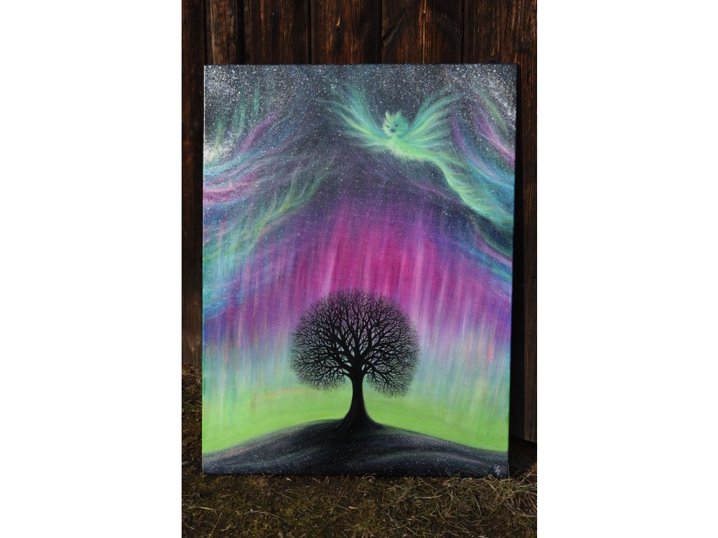 Při spontánní malbě tohoto obrazu jsem se lehce inspirovala fascinující polární září, která byla na našem území viditelná během pozdního večera 19.1. 2026. Vypravila jsem se ji fotit i přes nepříznivé podmínky větru a mrazu, které tou dobou byly u nás na severu Čech. Podařilo se mi ji zachytit na začátku ještě bez stativu nad naším domem a v její druhé polovině i se stativem na louce za vesnicí. Během příprav na výšlap jsem sice přišla o většinu jejího zeleného "lemování", ale alespoň jeho závěr se mi podařilo zachytit. Dál si však hrála ještě hodinu ve fialových, purpurových až červených tónech, která jsou na našem území běžnější. Byla to neskutečná nádhera. V životě jsem takovou parádu neviděla!