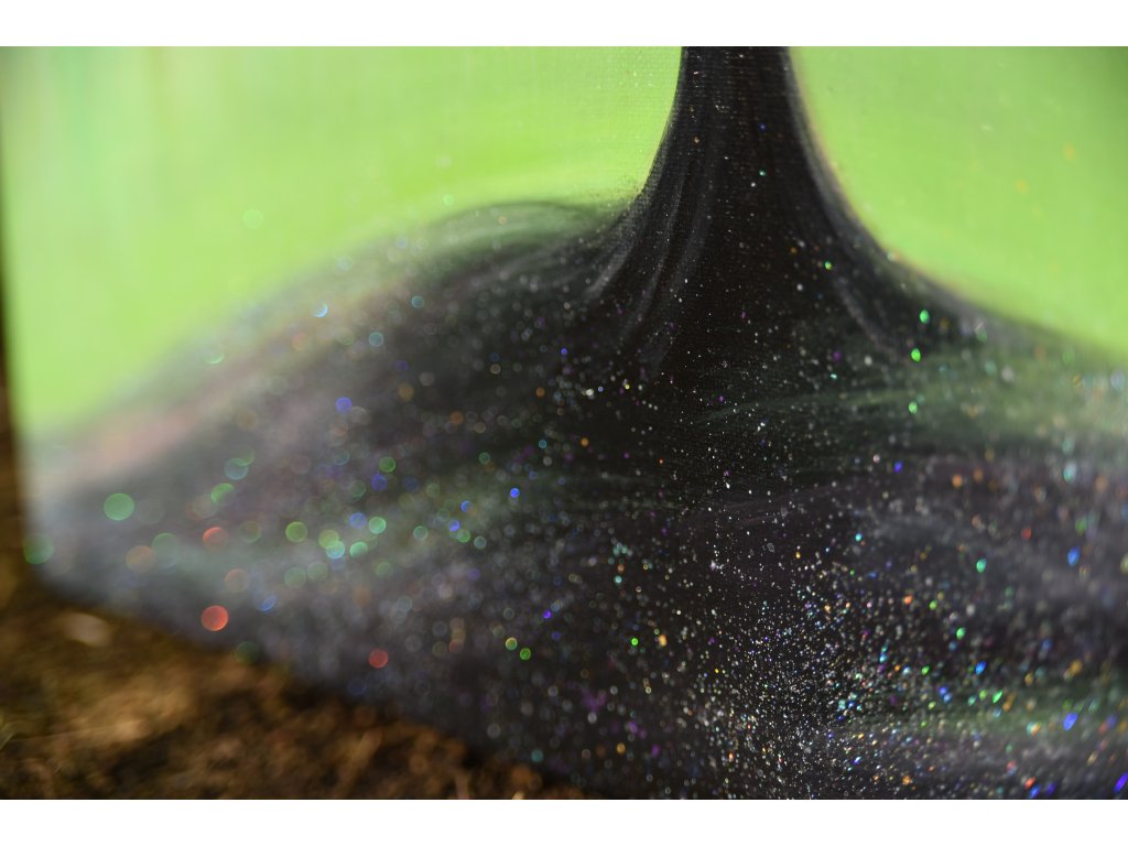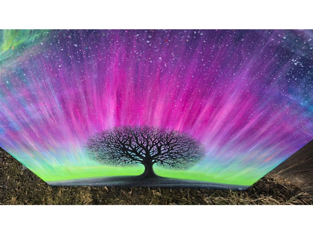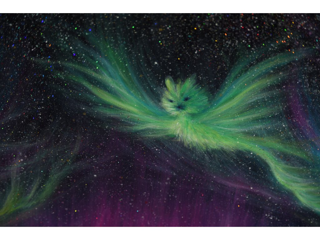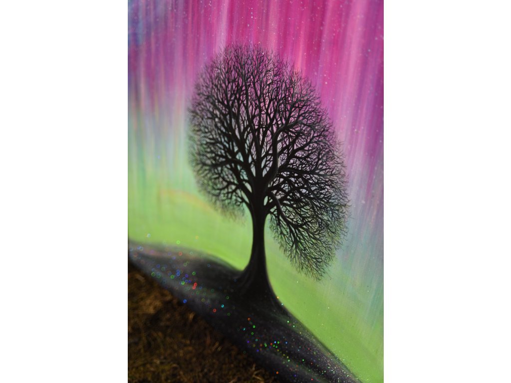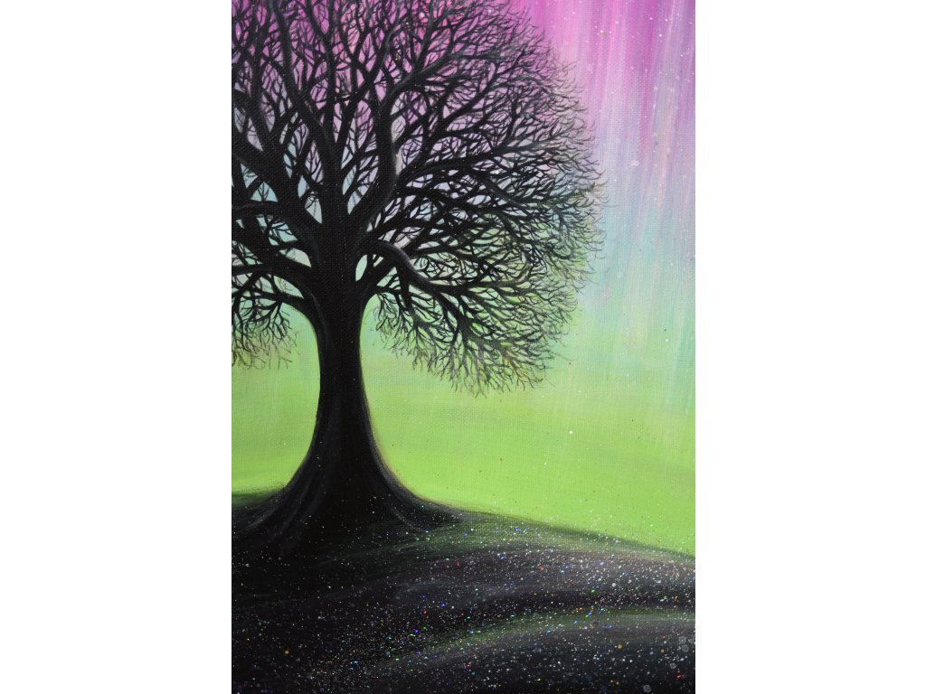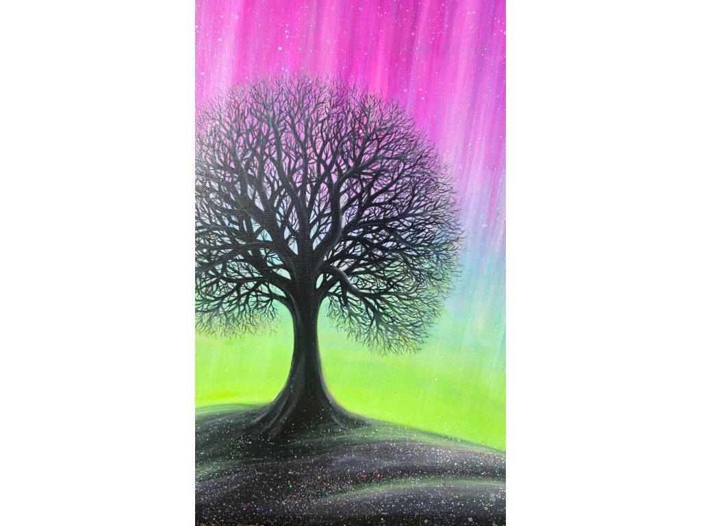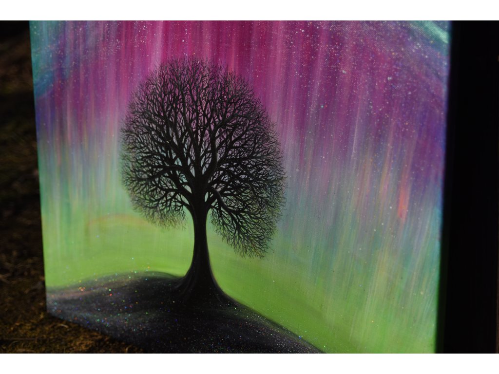 Při spontánní malbě tohoto obrazu jsem se lehce inspirovala fascinující polární září, která byla na našem území viditelná během pozdního večera 19.1. 2026. Vypravila jsem se ji fotit i přes nepříznivé podmínky větru a mrazu, které tou dobou byly u nás na severu Čech. Podařilo se mi ji zachytit na začátku ještě bez stativu nad naším domem a v její druhé polovině i se stativem na louce za vesnicí. Během příprav na výšlap jsem sice přišla o většinu jejího zeleného "lemování", ale alespoň jeho závěr se mi podařilo zachytit. Dál si však hrála ještě hodinu ve fialových, purpurových až červených tónech, která jsou na našem území běžnější. Byla to neskutečná nádhera. V životě jsem takovou parádu neviděla!
