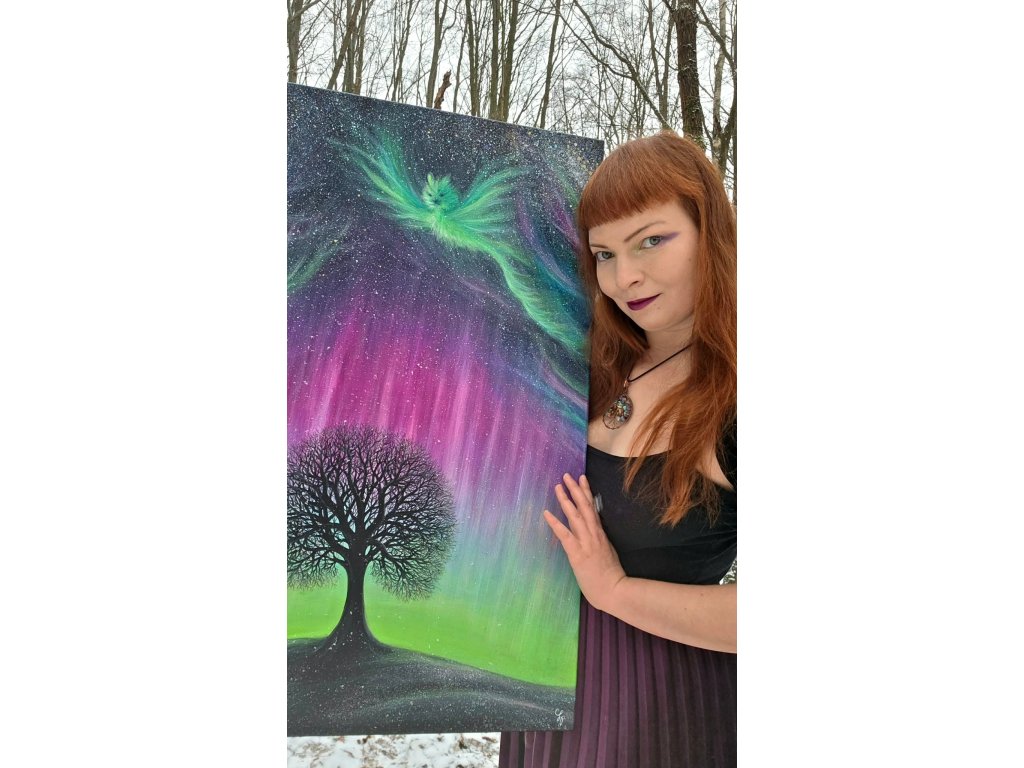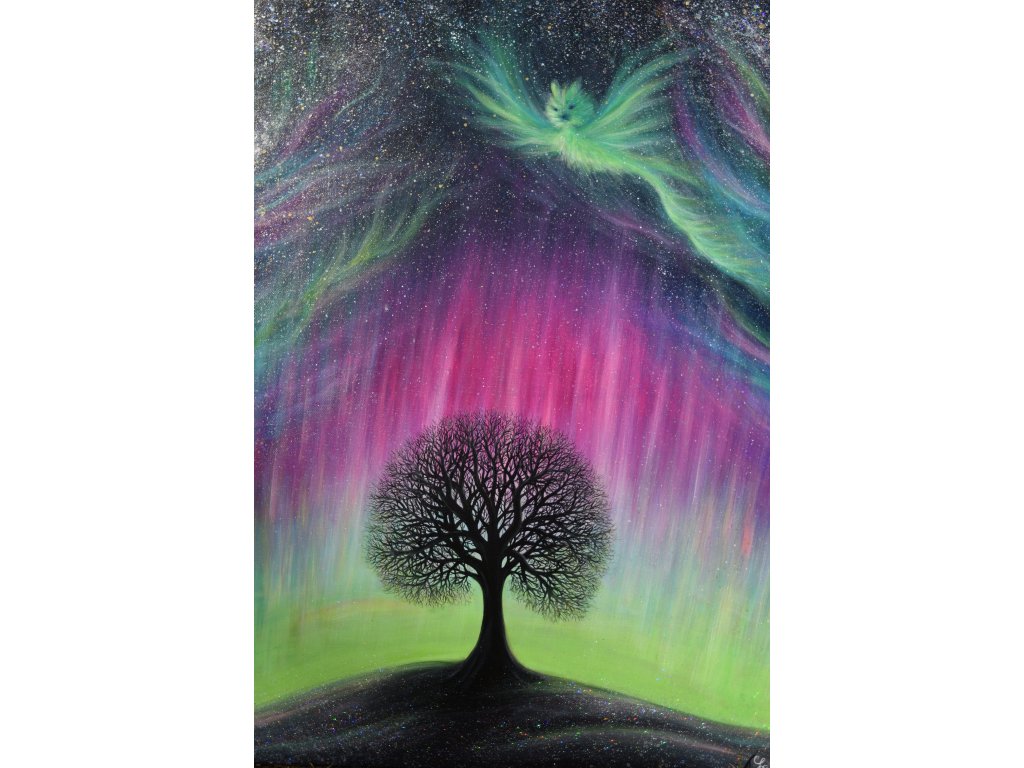 Ručně malovaný obraz s polární září, drakem a obrysem stromu "Duch polární záře" 60x80 cm- Louise Art