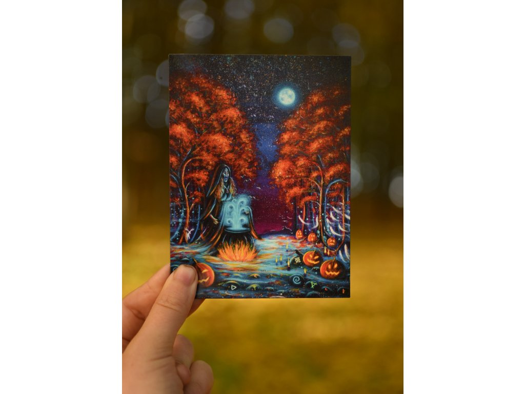 Magnetka velká s obrazem čarodějky, podzimního lesa a symboly Samhainu "Podzimní magie" 10x13 cm- Louise Art