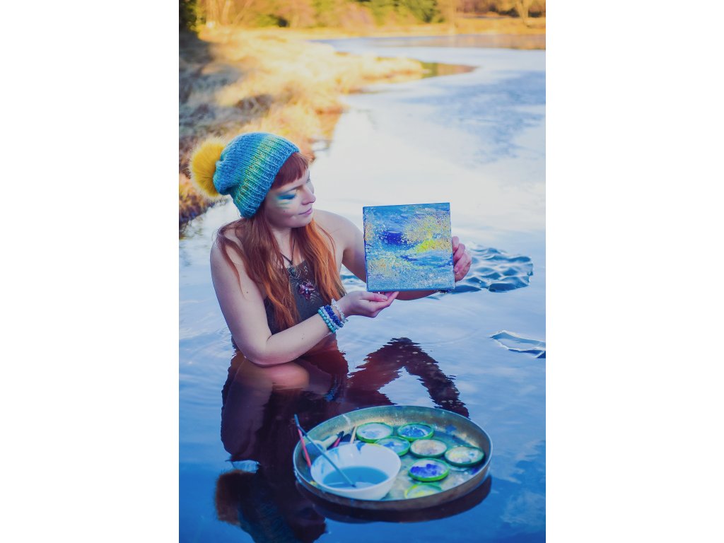 Tyto obrazy jsem začala malovat od listopadu 2019 s voláním vody. To volání přišlo po 2 letech otužování a chůze na boso, kdy jsem se postupně s ním dala na cestu k sobě sobě samé a má láska k vodě se ještě víc prohloubila. Skrze pravdivost ledové vody a ryzí síly přírody k otevření svého srdce do stavu přijetí, odpuštění, uvolnění, ke svému zdroji síly a pramenu tvořivosti, který jsem roky předtím shazovala.