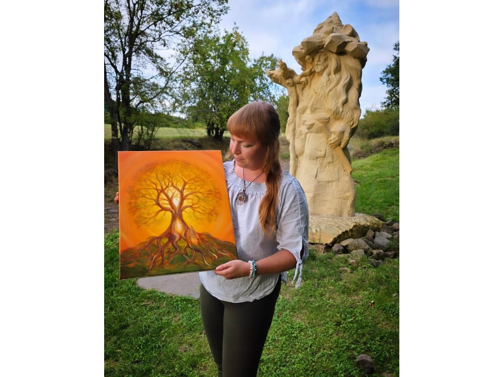 Obraz stromu života magického kelstského Hradiště u Hlinné jsem malovala přímo u sochy Středohoře na jeho úpatí a jeho energií na svém V. putování s malováním stromů života kopců Českého středohoří v roce 2025.